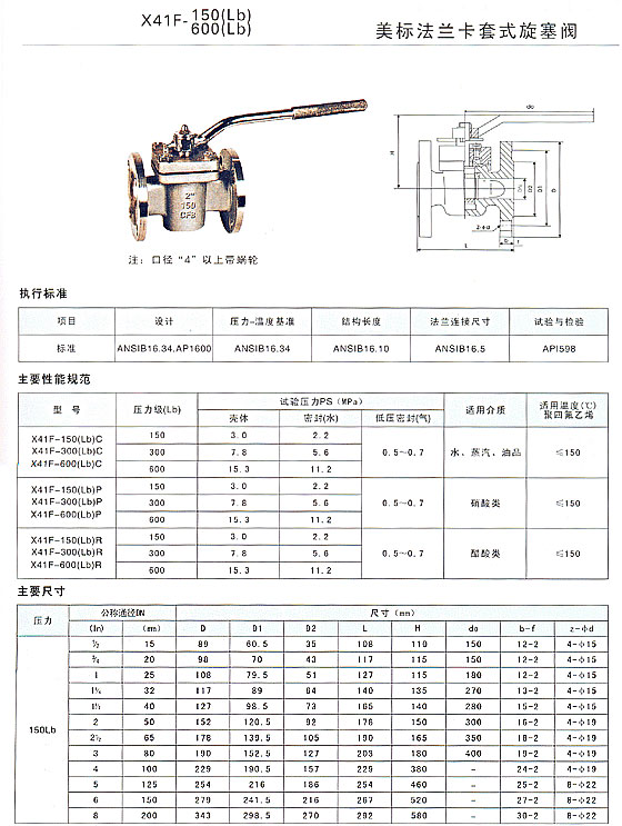 工稱壓力:150Lb、300Lb、600Lb; 適用溫度:≤ 150°C; 適用介質(zhì):水蒸汽、天然汽、油品,P:銷酸類,R:醋酸類; 材質(zhì):體蓋:WCB、CFB、CF8M,塞子:2Cr13、304、316,填料、墊片、襯套PTFE(聚四氧乙烯)