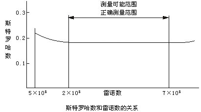 卡門渦街釋放頻率f和流速v成正比,因此通過測量卡門渦街釋放頻率就可算出瞬時流量。斯特羅哈數(shù)是渦街流量計的重要系數(shù)。在曲線的St≈0.17的平直部分,旋渦的釋放頻率與流速成正比,所以檢出頻率f就可求得流速v,由v求出體積流量。 |