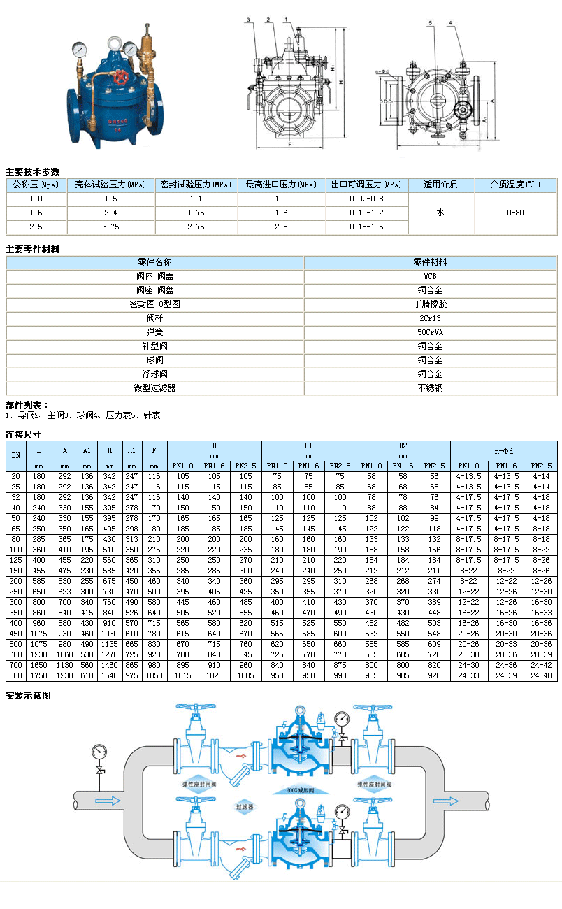 200X減壓穩(wěn)壓閥由主閥、導(dǎo)閥、針閥、球閥、微型過濾器和壓力表組成水力控制接管系統(tǒng)。使用時(shí),當(dāng)調(diào)定出口壓力后,能自動保持穩(wěn)定出口壓力。本產(chǎn)品利用導(dǎo)閥自力控制,不需要其它裝置和能源,保養(yǎng)簡便,壓力控制準(zhǔn)確度高,受進(jìn)口壓力和流量影響小,減壓穩(wěn)壓可靠。本系列閥門產(chǎn)品廣泛用于高層建筑、生活區(qū)等供水管網(wǎng)系統(tǒng)及城市供水工程。當(dāng)閥門從進(jìn)口端給水時(shí),水流過針閥進(jìn)入主閥控制室,出口壓力通過導(dǎo)管作用到導(dǎo)閥上。當(dāng)出口壓力高于導(dǎo)閥彈簧設(shè)定值時(shí),導(dǎo)閥關(guān)閉?刂剖彝V古潘,此時(shí)主閥控制室內(nèi)壓力升高并關(guān)閉主閥,出口壓力不再升高。當(dāng)閥門出口壓力降到導(dǎo)閥彈簧設(shè)定壓力時(shí),導(dǎo)閥開啟,控制室向下游排水。由于導(dǎo)閥系統(tǒng)排水量大于針閥的進(jìn)水量,主閥控制室壓力下降。進(jìn)口壓力使主閥開啟。在穩(wěn)定狀態(tài)下,控制室進(jìn)水、排水相同,主閥開度不變,出口壓力穩(wěn)定。調(diào)節(jié)導(dǎo)閥彈簧即可設(shè)定出口壓力。