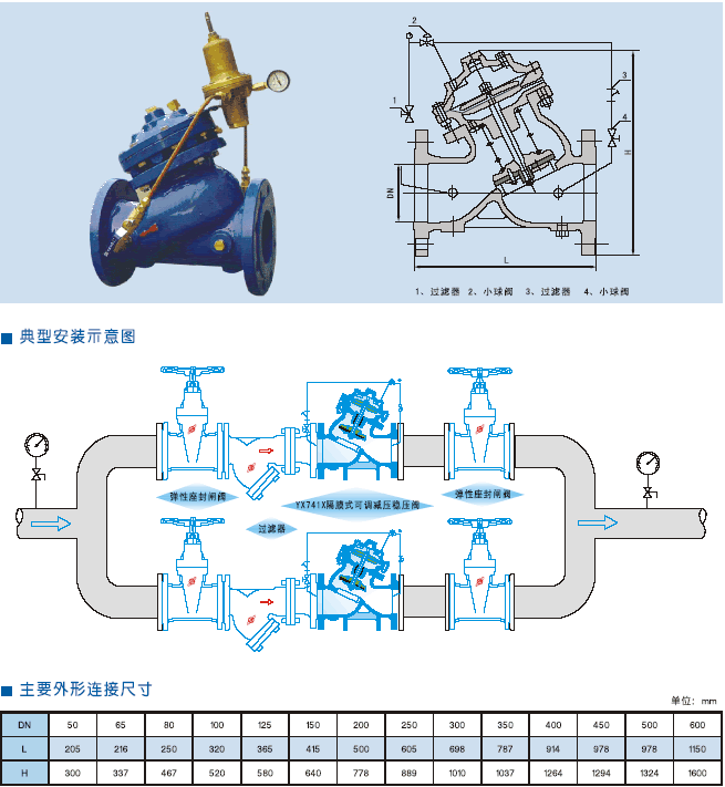 YX741X隔膜可調(diào)式減壓穩(wěn)壓閥是暗安裝于高層建筑給排水系統(tǒng)管道上,將進(jìn)口壓力減至某一需要的出口壓力的特種閥門。該閥門依靠本身能量使出口壓力保持穩(wěn)定在設(shè)定直,即出口壓力不因進(jìn)口壓力及流量的變化而變化,并且閥門控制系統(tǒng)的進(jìn)口處裝有一個自清潔濾網(wǎng),利用流體特性,使比重較大、直徑較大的懸浮顆粒不會進(jìn)入控制系統(tǒng),確保系統(tǒng)循環(huán)暢通無阻,使用門能安全可靠地運(yùn)行。系統(tǒng)動作靈敏,使用壽命長。