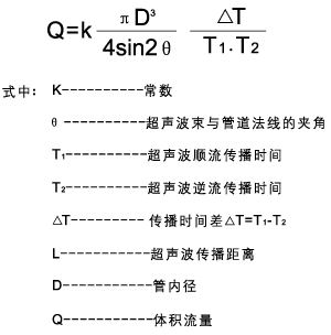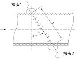 當超聲波在液體中傳播時,探頭1發(fā)射的超聲波脈沖被探頭2所接收,同時,探頭2也發(fā)射超聲脈沖,探頭1接收,則順流方向聲波傳播速度會增大,逆流方向則減小,同一傳播距離就有不同的傳播時間,利用傳播時間之差與被測流速之關(guān)系求取流速,進而得出流量,其關(guān)系式如下: