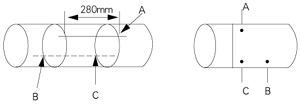去掉定位紙,從點C開始,在所劃直線上量出安裝距離L,從而決定出B點。這樣A、B兩點為安裝位置;例如L=280mm