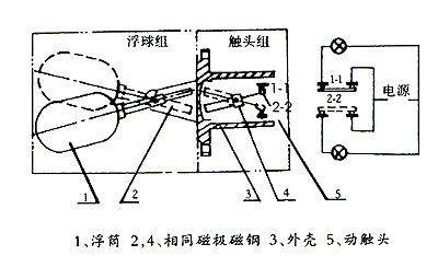 當(dāng)被測液位升高或降低時,浮球1隨之升降,使其端部的磁鋼2上、下擺動,通過磁力作用,推斥安裝在外殼3內(nèi)相同磁極的磁鋼4上、下擺動,其另一端的動觸點5便在靜觸頭1-1及2-2間連通或斷開。