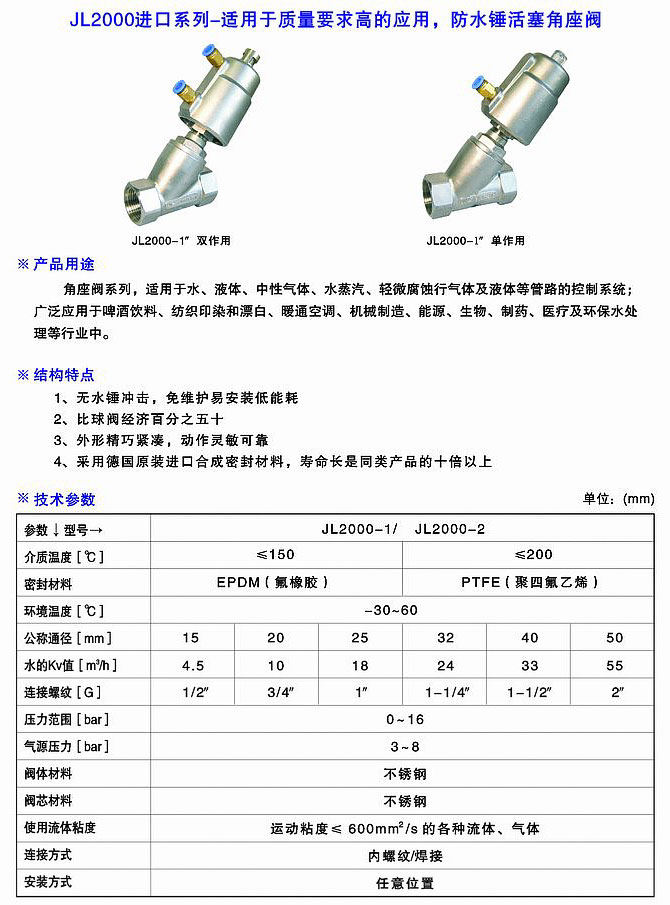 JL2000進(jìn)口系列雙作用角座閥是我公司的優(yōu)質(zhì)產(chǎn)品之一,在上海JL2000進(jìn)口系列雙作用角座閥廠家中享有極高的品質(zhì)聲譽(yù)與服務(wù)評(píng)價(jià).