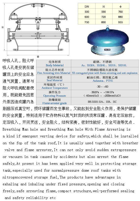呼吸人孔(KHXF-HR),阻火呼吸人孔是安裝在儲(chǔ)罐頂上的安全應(yīng)急勇氣裝置,通常與阻火呼吸閥配套使用,既能避免因意外原因造成罐內(nèi)急劇超壓或真空時(shí),損壞儲(chǔ)罐面發(fā)生事故,又能起到安全阻火作用,是保護(hù)儲(chǔ)罐的安全裝置,特別適用于貯存物料以氮?dú)夥忭數(shù)墓绊敵汗。具有定壓排放,定壓吸入,開閉靈活,安全阻火,結(jié)構(gòu)緊湊,密封性好,安全可造等優(yōu)點(diǎn)。