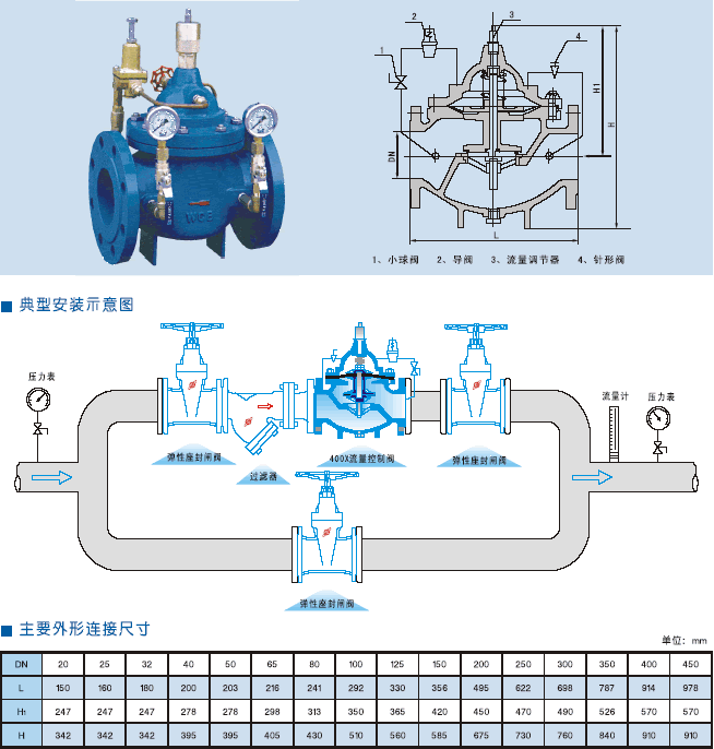 400X流量控制閥,是一種采用高精度先導(dǎo)式方式控制流量的多功能閥門。適用于配水管需控制流量和壓力的管道中,保持預(yù)定流量不變,將過大流量限制在一個預(yù)定直,并將上游高壓適當(dāng)減低,即使主閥上游的壓力發(fā)生變化,也不會影響主閥下游的流量。該閥一改常規(guī)節(jié)流閥使用孔板或純機(jī)械地減小流域面積的原理,利用相關(guān)導(dǎo)閥,大限度地減少能力在節(jié)流過程中的損失。如遇緊急情況400X流量控制閥可以完全截止流量,避免損失。控制靈免度高,安全可靠,調(diào)試簡便,使用壽命長。 |