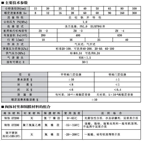 ZMA(B)T一10氣動薄膜隔膜調(diào)節(jié)閥為無填料函結(jié)構(gòu)、節(jié)流元件為彈性隔膜,閥體流道平滑;閥體襯里和隔膜均可采用耐腐蝕材料制造,適用于控制各種腐蝕性和懸浮液介質(zhì)的調(diào)節(jié)場合。