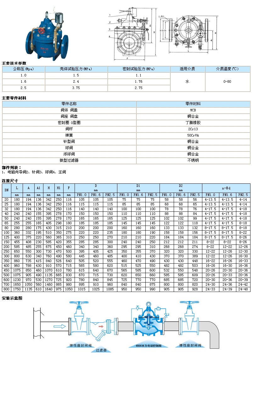 600X水力電動控制閥由主閥、電磁導(dǎo)閥、針閥、球閥、微形過濾器和壓力表組成水力控制接管系統(tǒng)。通過電磁導(dǎo)閥可以實(shí)現(xiàn)對閥門開啟和關(guān)閉的遙控。加裝附加裝置后,可控制開啟和關(guān)閉的速度。本產(chǎn)品利用導(dǎo)閥控制閥門的開啟和關(guān)閉,節(jié)省能源。可代替其它閥門大型電動裝置。本系列閥門產(chǎn)品廣泛用于高層建筑、生活區(qū)等供水管網(wǎng)系統(tǒng)及城市供水工程。當(dāng)閥門從進(jìn)口端給水時(shí),水流流過針閥進(jìn)入主閥控制室,當(dāng)電磁導(dǎo)閥打開時(shí),控制室內(nèi)的水經(jīng)電磁導(dǎo)閥、球閥流出。球閥開度大于針閥開度,主閥控制室內(nèi)壓力很低,主閥處于全開狀態(tài)。